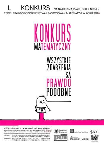 Wrocławski oddział Polskiego Towarzystwa Matematycznego zaprasza na sesję naukową poświęconą rozstrzygnięciu 50. Konkursu Na Najlepszą Pracę Studencką Z Teorii Prawdopodobieństwa i Zastosowań Matematyki.